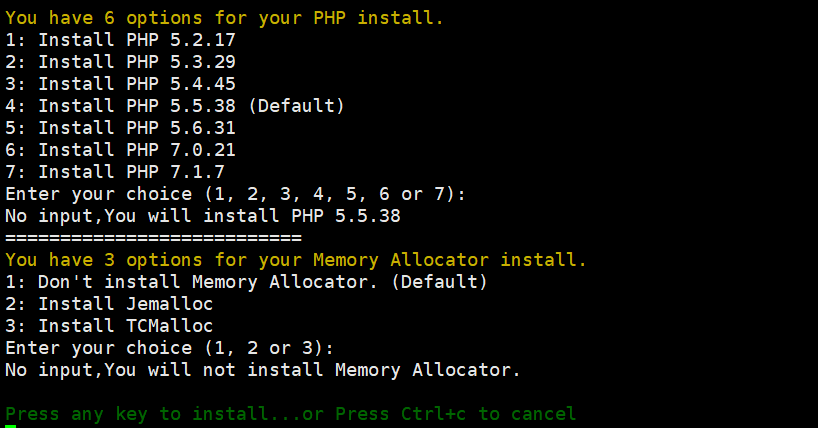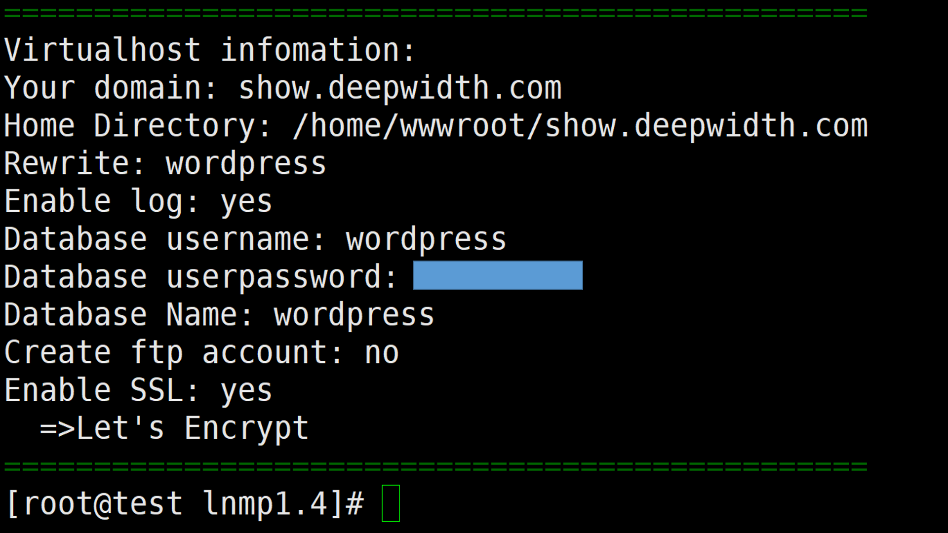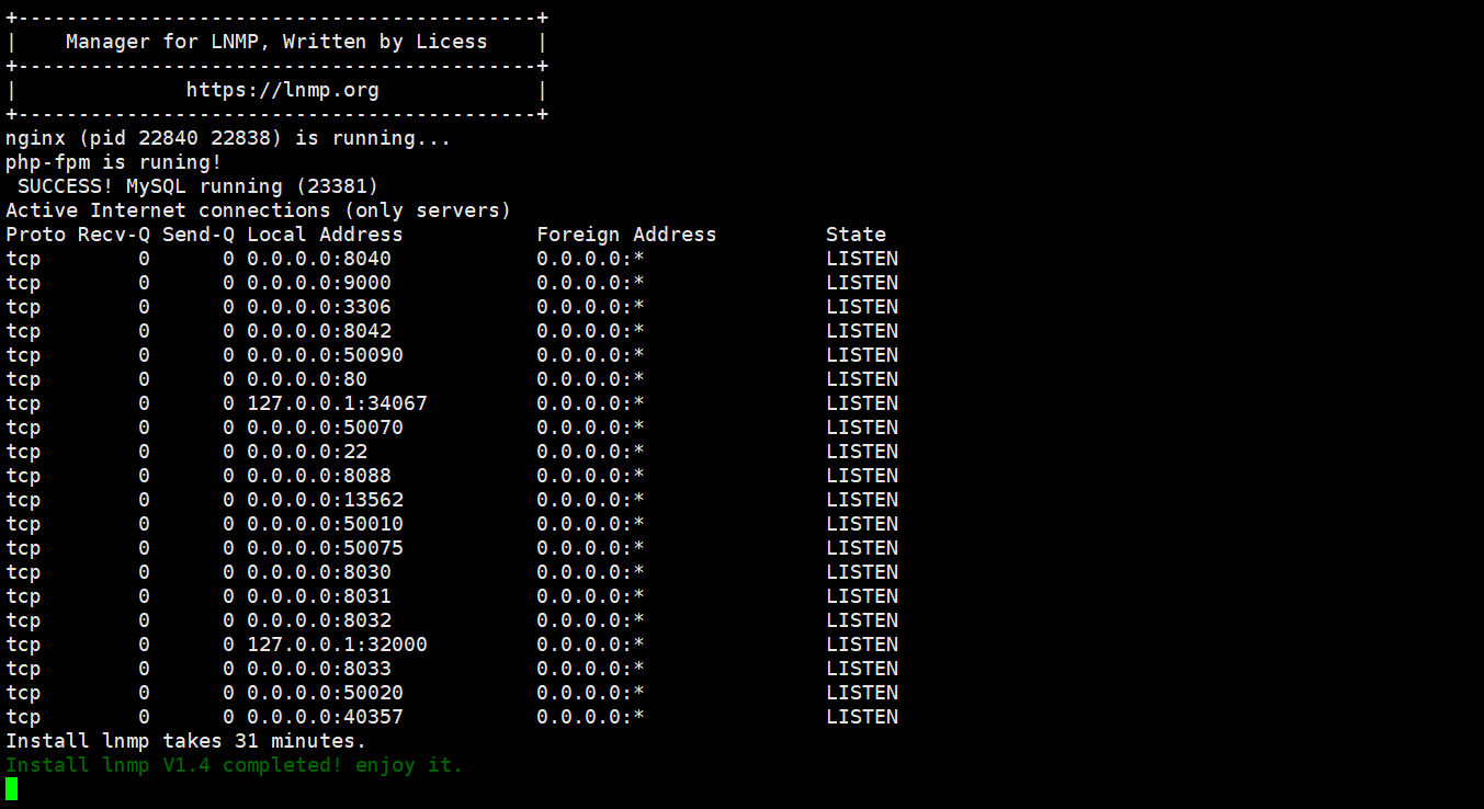 所有选项选择后,按任意键开始安装,这一过程会持续较长时间(30mins-40mins),如果你等不及,你可以去喝杯茶。如果你不小心关闭了SSH连接,再次建立连接之后,输入screen -x lnmp然后你就到了之前为lnmp安装进程创建的窗口,screen的用途体现于此 看到下面这个页面,说明lnmp1.4安装成功
