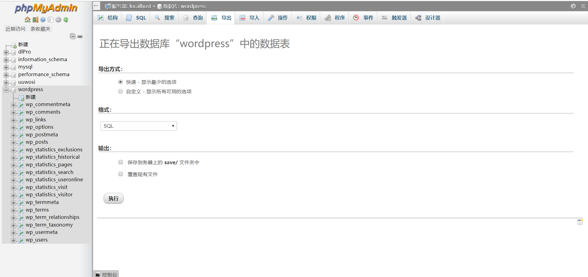 登录到你的Mysql数据库,然后在左边选中博客的数据库,点击上方的导出选项,然后点击页面下方的执行,就可以把博客的数据库以sql的文件形式下载到本地了