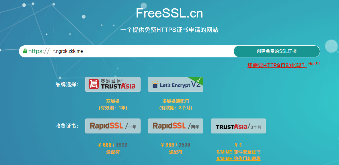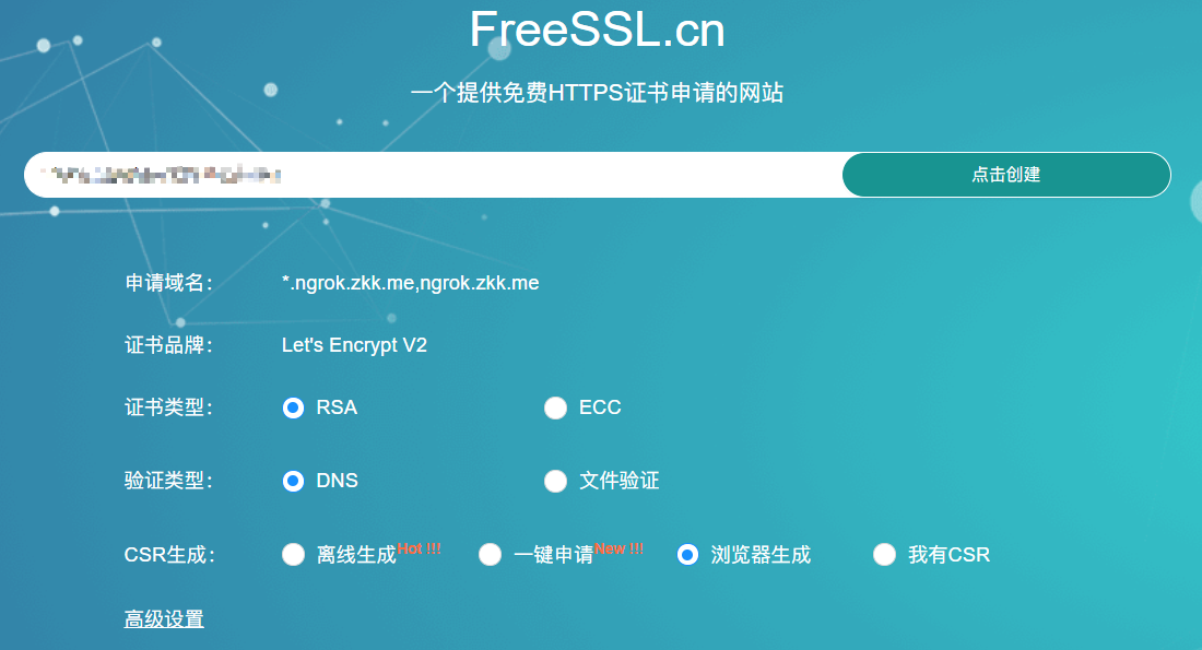 *.ngrok.zkk.me,品牌选择Let's Encrypt V2,然后点击“创建免费的SSL证书”