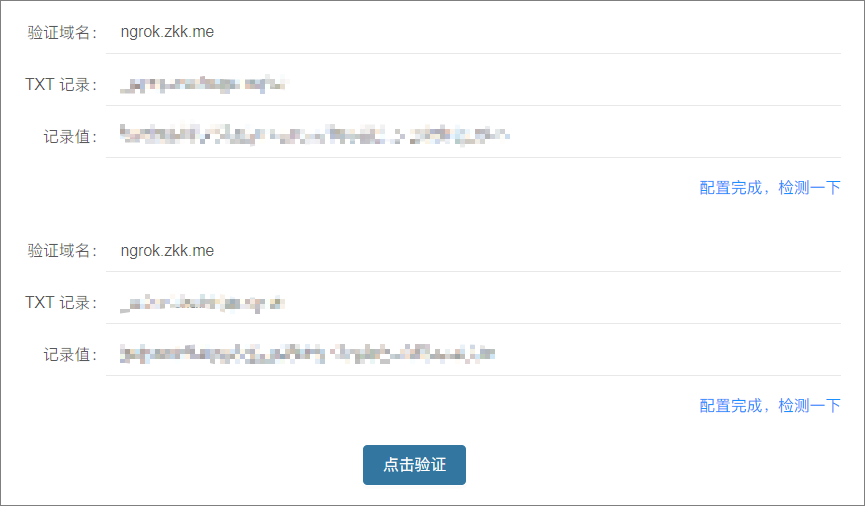 - 然后来到域名验证页面。只要按照要求对域名进行了TXT解析,然后两个都检测通过的话基本上就可以验证成功。