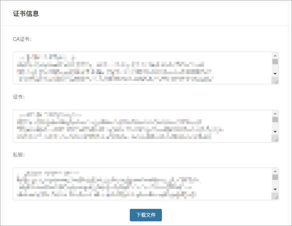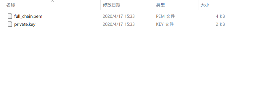 点击下载文件会下载一个zip压缩包,里面是申请到的SSL证书和私钥,这个私钥与刚才下载的那个文件相同。保存好这两个文件,后面需要用到