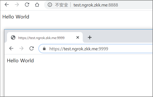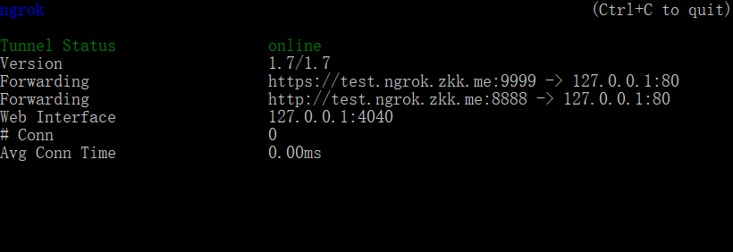 上面输出的内容意思是:当在浏览器访问http://test.ngrok.zkk.me:8888 时会以http形式转到本地80端口,当在浏览器访问https://test.ngrok.zkk.me:9999 时也会以http形式转到本地80端口。这也是之前我为什么说如果你在ngrok.cfg中的本地使用的端口配置了ssl就会出现400错误。