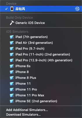 然后你就可以无线真机调试了,以后也不再需要连接数据线,只需要Mac和真机在同一个无线网络内,打开Xcode项目,等待设备选择列表中你的真机出现地球图标即可。